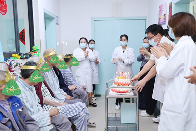 寿辰同庆,爱在端阳。二病区特别关注老年群体,精心为住院高龄老人庆祝生日。医护人员准备了生日蛋糕,点上生日蜡烛,齐唱生日歌,真挚的祝福与粽香交织。这份双重惊喜让老人倍感温暖,脸上洋溢着幸福笑容,深切感受到医院如家般的关怀与尊重。