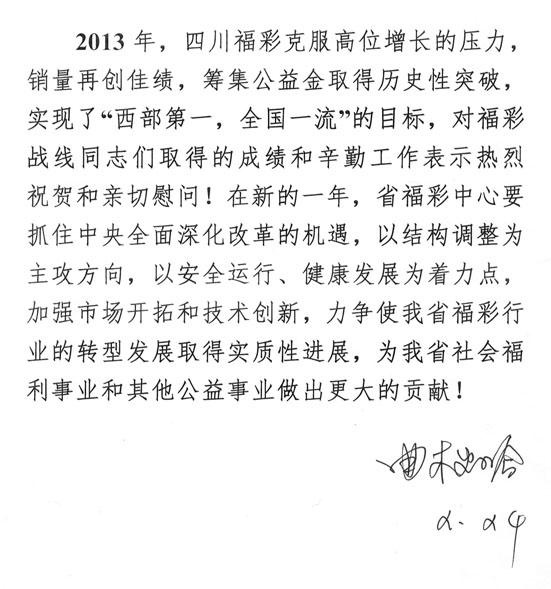 大河泱泱,山高水长,2014年将是四川福彩转型发展不懈求索的一年;岁月不居,时不我待,2014年将是继往开来抢抓机遇的一年;千帆竞发,挺立鳌头,2014年将是奋发拼搏大展宏图的一年。在省民政厅的坚强领导下,在省财政厅的大力支持下,省福彩中心将不懈努力,实现福彩事业的历史性跨越,创造福彩事业更加美好的明天! (本报记者 展翔)