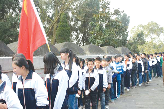 松柏苍翠映陵园,丰碑矗立赞英魂,烈士碑前庄严肃穆。近日,东兴区关工委组织双才中心校300余名共青团员到双才烈士陵园祭扫烈士墓,寓爱国主义教育于清明节扫墓活动中。大家肃立默哀三分钟、向革命先烈三鞠躬、鸣放礼炮,表示对先烈的深切悼念。(赖明先)