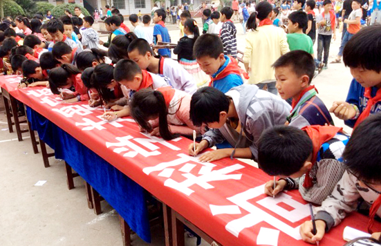 近日,华蓥市高兴镇小学开展“小手拉大手,校园反邪教”教育活动,增强学生及家庭识别、抵制邪教意识。当日,该校1000余名学生家长参加了各班主题教育活动,与学校郑重签订《“家庭拒绝邪教”责任承诺书》1700余份。图为该校学生在“崇尚科学,反对邪教”横幅上签名。(雷长生 蒋慕宏)