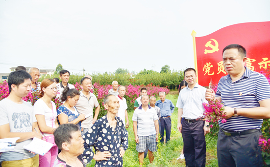 近日,华蓥市禄市镇贫困村大坡老村“第一书记”李杰、姚家塝村“第一书记”汪红波分别带领村支“两委”班子成员和部分党员代表共50余人赴邻村凉水井村观摩学习、实地培训。图为海棠博览园党员业主李天云实地现场讲授紫薇花采摘技术。(王晓均 摄影报道)