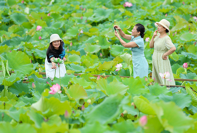 仲夏时节,华蓥市明月镇白鹤咀村利用治理后的渠江滩涂种植的荷花相继绽放,吸引不少市民前来打卡游玩。