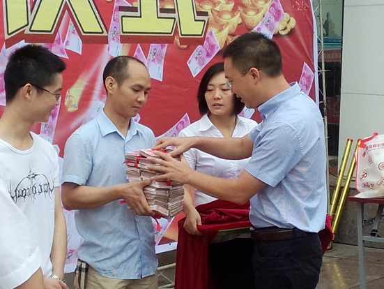 9点30分颁奖仪式拉开序幕,首先中福在线城北大厅在龙马商业广场举行了免费的幸运投篮、好运飞镖等趣味游戏,吸引了一大批市民的参加。10点钟,广安中福在线龙马厅经理介绍了大奖得主的中奖经过后,终于请出了两位50万大奖幸运得主。当100万大奖现金由礼仪与保安护送上台呈现在大家眼前时,台下的观众都看得目不转睛。随后,广安市福彩分中心主任伍海军给两位获奖的幸运彩民颁发百万大奖,“一万、两万、三万……八十万”,当最后一万元现金送到获奖者手中时,天空中突然绽放出美丽的礼花,人群中顿时爆发出一阵阵惊呼声,活动现场达到了最高潮。