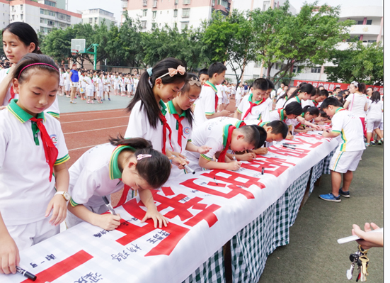 日前,由宜宾市爱卫办、宜宾县爱卫办和宜宾县教体局主办,宜宾县育才路小学承办的宜宾市中小学“拒吸第一支烟,做不吸烟的新一代”签名仪式活动在该小学举行,1500余名学生代表参加了签名活动。通过此次活动,希望孩子们以签名活动为起点,坚定信心,立下拒吸第一支烟,做不吸烟的新一代的志向,养成良好的文明、健康习惯,在无烟的环境里健康成长。图为学生们正在郑重签名。(朱俊聪)
