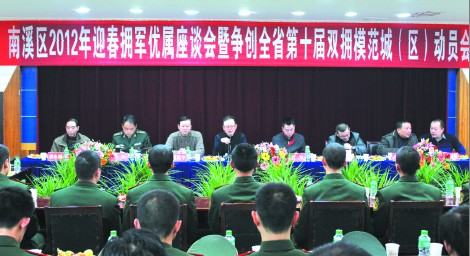 本报讯 新春佳节来临之际,南溪区召开2012年迎春拥军优属座谈会暨争创全省第十届双拥模范城(区)动员会。区委、区政府、区人大、区政协、区人武部领导,驻南部队的官兵及军队离退休的老同志代表、区直有关单位的负责人、乡镇分管领导、民政办主任和优抚对象代表等共120余人欢聚一堂共话南溪美好未来。 南溪区委书记李学焦说,在过去一年里,南溪区城乡面貌发生了显著变化,各项事业取得了全面进步,人民生活水平不断提高,社会局势持续稳定,各方面得到了快速发展,圆满完成年初确定的各项目标任务,实现了“十二五”规划开门红。这些成绩的取得,离不开驻南部队武警官兵的大力支持和积极参与。多年来,南溪区积极开展军警民共建活动,为群众办实事、做好事、解难事,充分体现了军民鱼水情深,以实际行动赢得了全区各届人士的拥护和称赞。南溪将以争创四川省第十届双拥模范城(区)为起点,树立高目标,扎扎实实,一步一个脚印地抓好南溪双拥工作,进一步巩固军民之间“同呼吸、共命运、心连心”的良好局面,把南溪双拥工作提高到一个新水平,再出新成绩,争创“双拥模范区“四连冠,为南溪区三个文明建设作出新贡献。(王昌伦)