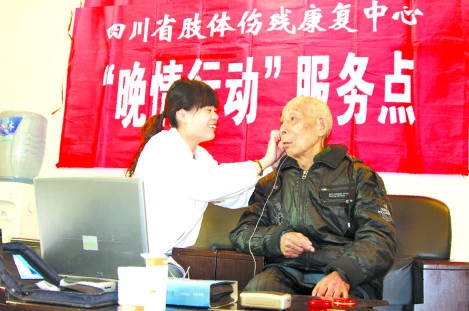 近日,四川省肢体伤残康复中心专家组莅临邻水,为该县131名肢体残疾的城市“三无”、农村“五保”对象免费装配了价值9万余元的假肢、助听器、轮椅、拐杖等矫形康复辅具144具(辆、付)。 据了解,“晚情行动”是由四川省民政厅主办,利用福利彩票公益金留存资金开展的扶老、助残、济困等公益行动。图为四川省康复中心的医务人员为五保老人调试助听器。(郑岚宁)