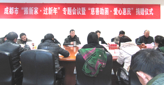 本报讯 1月14日,“搬新家、过新年”专题会议暨“慈善助困·爱心惠民”捐赠仪式在成都市慈善总会召开。成都市慈善总会常务副会长王莉琳,副秘书长杜永慧、廖文武等出席,福州芬香粮油食品有限公司常务副总经理张宁作为主要嘉宾参加仪式。参加仪式的还有成都各区(市)县慈善会的相关负责人以及成都市慈善总会工作人员和新闻媒体记者40余人。仪式由杜永慧主持。