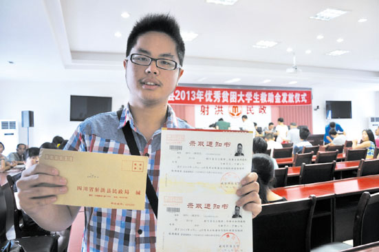 射洪县从2002年开始,建立起了扶贫帮困助学的长效机制,为全县的贫困大学生架起了通向成功的桥梁。这项活动已经进行了11个年头,今年是第12个年头,累计发放救助金400余万元,救助2000多名寒门学子顺利地踏进校园,圆了他们孜孜以求的大学梦。这项惠民利民工程的实施,受到了人民群众的高度赞誉,唤起了社会各界对广大贫困学子的关心和救助,营造了一个充满温暖和爱心的社会环境,使贫困大学生及其家庭亲人感受到了社会主义大家庭的幸福和温暖。(张萃福 罗杨君)