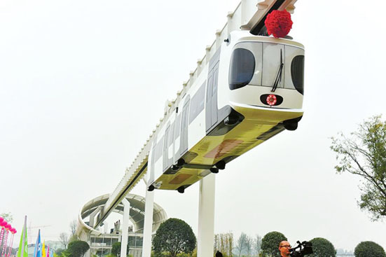 当日,数百人先后登上了这辆“熊猫号”空铁,抢鲜试乘。戴上大红花,车头车身尽以熊猫元素装扮的空铁,以60公里的时速一路“飞行”……由此打开了改善城市拥堵的想象空间。