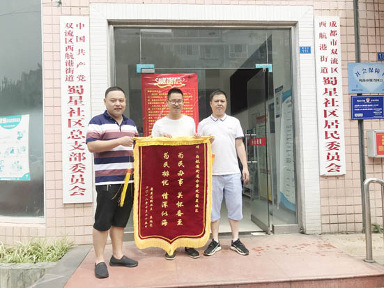 当日,吴先生一行特地从乐山赶到成都,为蜀星社区送上锦旗与感谢信。在蜀星社区服务大厅,吴先生找到了社区主任杨国强,一见面,吴先生感慨地说道:“感谢您们呀!现在终于好了,铺面不得渗水发潮了!”