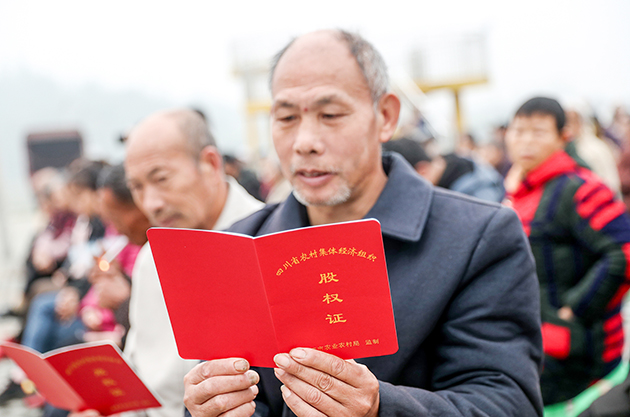 近日,广安华蓥市在永兴镇大佛山村召开农村集体资产股权确权颁证暨收益分配权抵押担保试点大会,大佛山村股份经济合作联合社近300名成员参加会议并领取农村集体经济组织股权证,部分成员还现场与该市农商银行签订了农村集体收益分配权抵押担保货款个人借款合同。(邱海鹰 摄影报道)