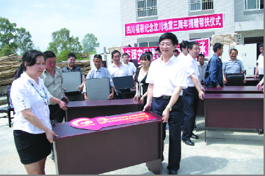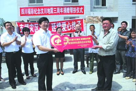 5月10日,以“支援灾区建设 延续爱心传承”为主题的四川福彩纪念汶川地震三周年捐赠帮扶活动在绵阳江油市东兴乡阳光村举行。四川省福利彩票发行中心主任刘仲远率领省福彩中心全体党员干部职工一早赶赴绵阳江油市东兴乡阳光村,为该村送去了价值2万多元的电脑等办公设施,解决了该村村委灾后重建的全部办公设施。这是自2008年以来省福彩中心党员干部第三次走进东兴乡。前两次走进东兴乡,省福彩中心为当地贫困户送去了慰问金、化肥及春节急需品,为当地敬老院送去了90台电视机。