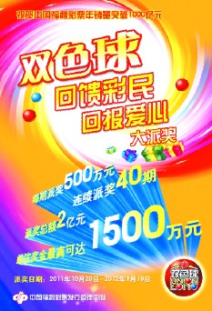 在中国福利彩票年销量即将突破1000亿元之际,为了感谢社会公众对中国福利彩票的支持和厚爱,经财政部《关于开展中国福利彩票双色球派奖活动有关事项的通知》(财办综[2011]109号)批准,中国福利彩票发行管理中心将于2011年10月20日启动双色球2亿元派奖活动以回馈彩民。 本次派奖活动从2011年10月20日(双色球第2011123期)开始,连续派奖40期,每期加奖500万元,共使用双色球调节基金2亿元,这是福利彩票双色球自上市以来第六次大规模的派奖活动。 派奖活动期间,每期安排500万元作为派奖奖金,加给当期一等奖,派奖奖金由当期所有一等奖按中奖注数均分。若当期一等奖未中出,则当期派奖奖金滚入下一期,与下一期派奖奖金合并后,按下一期一等奖中奖注数均分,依此类推。 单注派奖奖金最高限额500万元,当期派奖奖金按一等奖中奖注数均分后,若单注派奖奖金超过500万元,则超过部分滚入下一期,与下一期派奖奖金合并后派奖。 若派奖活动最后一期一等奖未中出,或者派奖奖金按一等奖中奖注数均分后单注派奖奖金超过500万元,则派奖活动往后顺延,直至派奖奖金派发完毕为止,但不再增加新的派奖奖金。本次派奖活动所需资金从中国福利彩票双色球调节基金中支出。 按照活动规则,如果当期一等奖只中出1注,一等奖奖金最高可达1500万元,也就是说,花2元钱购买双色球就有机会中得1500万元。“回馈彩民,回报爱心”,相信在本次派奖活动期间,新老彩民在奉献爱心的同时,也会收获更多回报和意外惊喜。