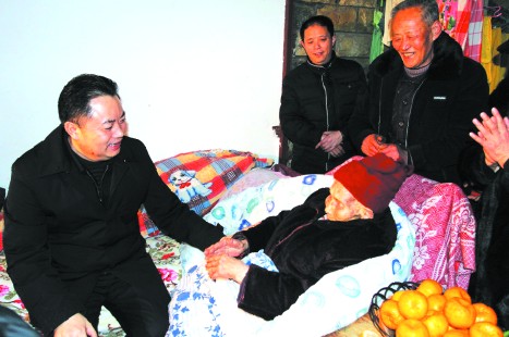 本报讯 为切实改善民生,进一步解决困难群众生产生活问题,充分体现党和政府对困难群众的关怀,新春之际,眉山市委副书记、市长宋朝华带领市民政局、市委组织部、市总工会、市残联等部门负责人,在仁寿县委书记冉登祥、县长秦彪、县民政局王继伟等领导的陪同下,深入仁寿景贤乡马贤村和敬老院、县人民医院、仁寿一中、文林镇城区,看望慰问敬老院五保老人、困难党员和职工以及优秀人才、知识分子代表,给他们送去了市委、市政府的关心,送上新年的美好祝福,并发放14500元慰问金和价值9000元的大米、食用油、猪肉、棉絮等慰问品。 宋朝华询问了五保老人的生产生活情况、医疗条件,要求各级党委、政府要关心好、照顾好、服务好五保老人。在景贤乡马贤村座谈慰问中,宋朝华充分肯定了马贤村的发展成绩,要求村两委要继续努力,加快产业发展,积极拓宽群众增收渠道,特别要帮助困难群众走上小康之路,实现共同富裕。在百岁老人黄淑云家中,宋朝华拉着老人的手,祝愿老人健康长寿,合家幸福,笑口常开。在文林镇看望慰问城区困难群众时,宋朝华祝愿他们春节愉快,并要求各级党委、政府要真情服务群众,全力帮助困难群众渡过难关,困难群众一定要鼓起生活的勇气,坚定信心,振奋精神,克服暂时的困难,迎接幸福美好的明天。(汪慧)