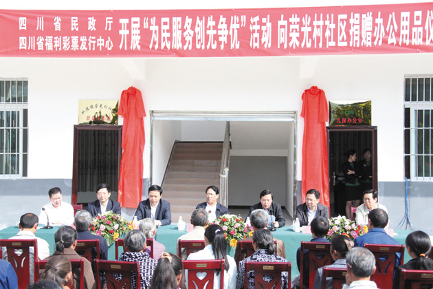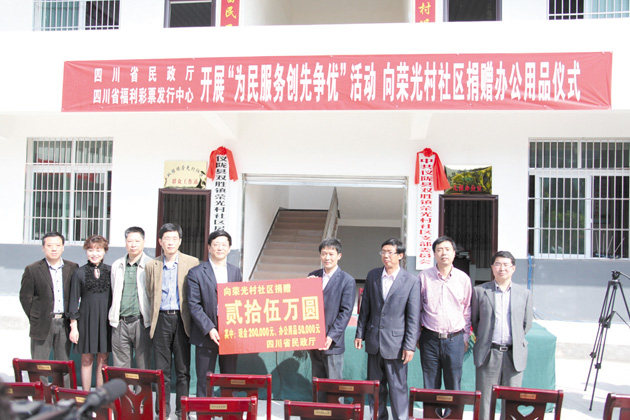 为积极响应省委、省政府开展“挂包帮”活动的号召,大力支持老区的社会经济全面发展和人民安居乐业,2012年4月20日,四川省民政厅、四川省福利彩票发行中心在南充市仪陇县荣光村开展了“为民服务创先争优”结对帮扶捐赠仪式。省民政厅、省福彩中心向荣光村村委会捐赠了20万元现金和价值近5万元的办公设施。省政府张作哈资政、省民政厅黄明全厅长出席了捐赠仪式。捐赠仪式由民政厅直属机关党委书记廖永康主持。