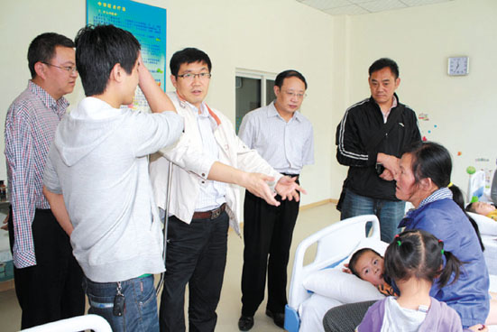省残联党组成员、副理事长马骏(左三)指导残疾人康复工作