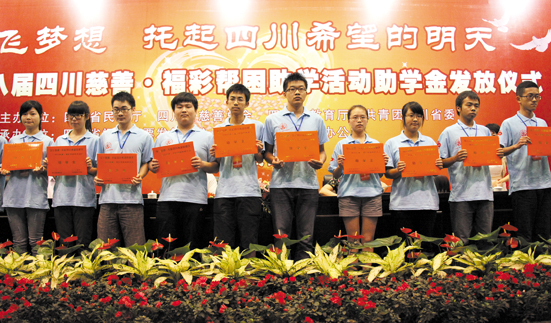 “放飞梦想,托起希望的明天”。8月22日,2012第八届四川慈善·福彩帮困助学活动助学金发放仪式在四川省成都市举行。本次四川省省级募集的500万元资金资助了1000名贫困学生,将按照5000元的标准发放给省内外院校录取的学生。