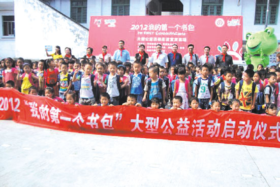 本报讯 近日,在宜宾市妇联的牵线搭桥和协助下,凯德公司一行在驻宜总经理闵强的带领下驱车前往宜宾县高场镇小学校,为该校180名一年级新生捐赠了“2012我的第一个书包”。书包里装有新华字典和彩笔等文具,同时,还为孩子们捐赠了800册图书。背上崭新的书包,幸福洋溢在180名孩子灿烂的笑脸上。