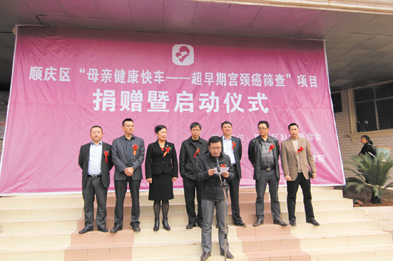 副区长李建中、妇基会李福主任、妇联李兰英主席、区卫生局副局长谭勇(前)在捐赠仪式上