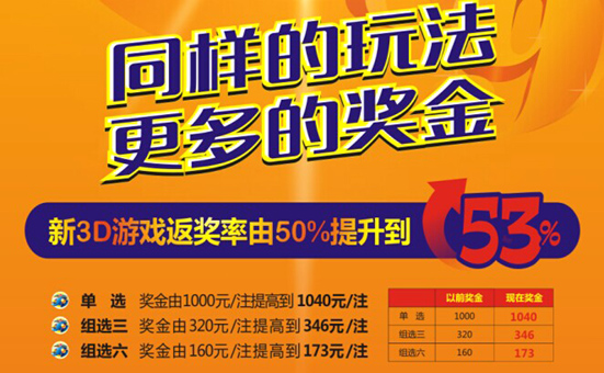 福彩3D返奖率将提高至53%