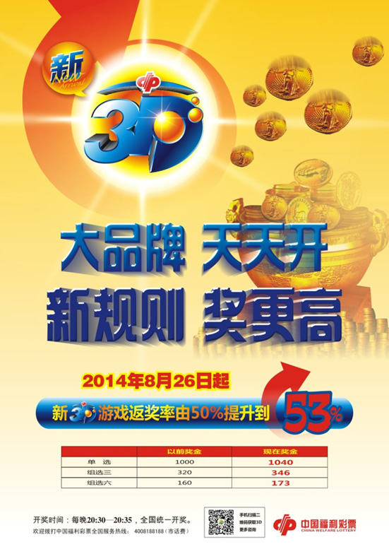 为了进一步提升3D游戏的品牌形象,经财政部批准,自3D第2014230期(2014年8月26日)起,变更中国福利彩票3D游戏规则:返奖率将从原有50%调整至53%。这意味着福彩3D在玩法不变的情况下,却能够赢得更高的奖金。