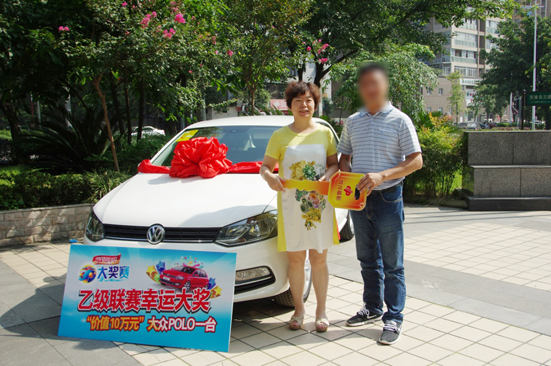 9月4日上午,四川省福利彩票发行中心主任江涛、副主任李萍分别为乙级联赛第一赛季幸运的两位大奖得主颁奖。两位彩民欢天喜地将POLO车开回了家。