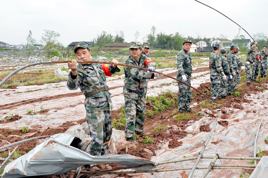 武警广安市支队的官兵在帮助群众恢复被狂风摧毁的大棚 (邱海鹰 摄)