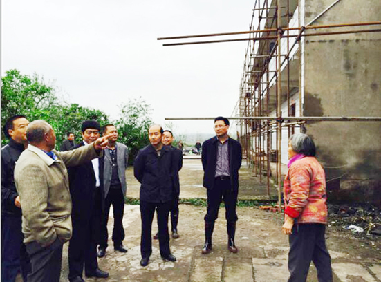 4月7日下午,四川省民政厅张力副厅长一行来到武胜县三溪镇观音桥村灾区现场,检查指导救灾工作,图为张力副厅长(中)在武胜县委政府相关领导陪同下正在询问灾区老人的受灾情况。(雷盛林 摄)