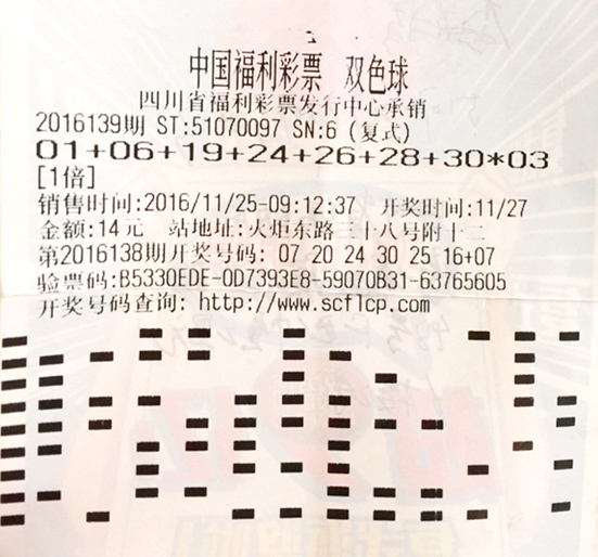 11月27日晚,福彩双色球第2016139期开奖,当期开出的红球为01、06、19、26、28、30,蓝球为03。来自四川绵阳市火炬东路38号附12号第51070097号福彩投注站的一位彩民,竟然用一张14元的“7+1”复式投注搞定巨奖1495万元!开奖次日,绵阳巨奖得主就在家人的陪同下,火速领奖。