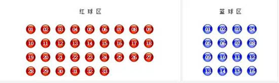 蓝色球号码复式:从红色球号码中选择6个号码,从蓝色球号码中选择2—16个号码,组合成多注投注号码投注。