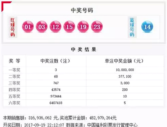 9月19日晚,中国福利彩票双色球游戏进行第2017110期开奖。当期双色球红球号码为01、03、12、15、19、23,蓝球号码为14。