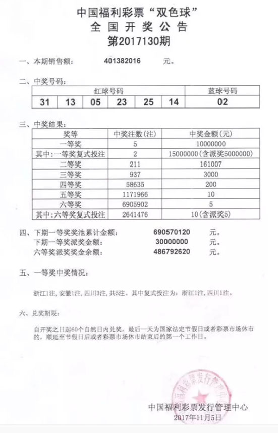 11月5日晚,中国福利彩票双色球游戏进行第2017130期开奖,这是2017年双色球9亿元派奖活动启动后第一期派奖,当期双色球红球号码为05、13、14、23、25、31,蓝球号码为02。