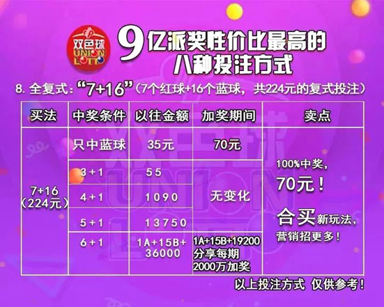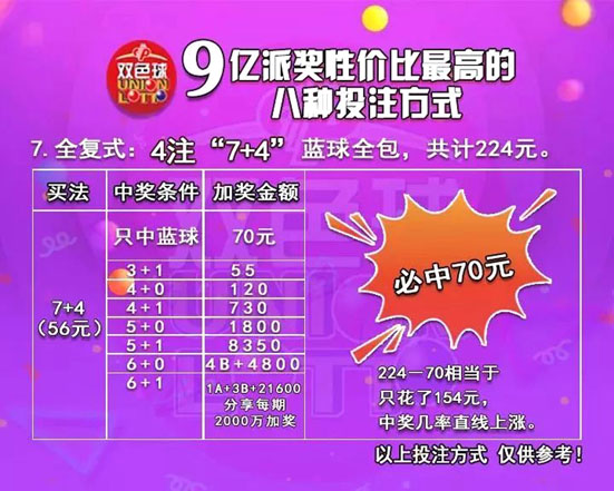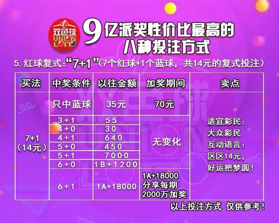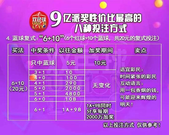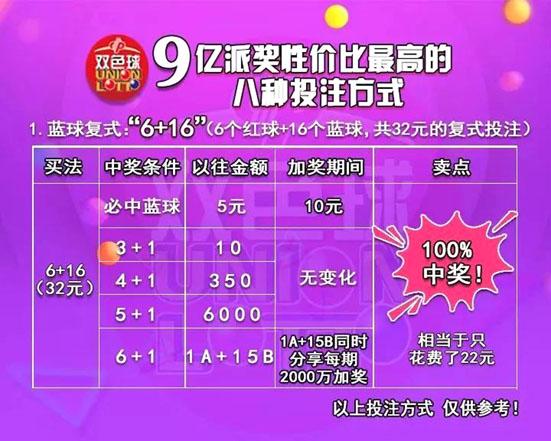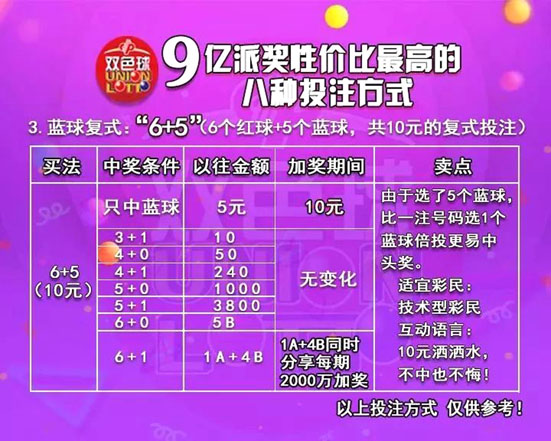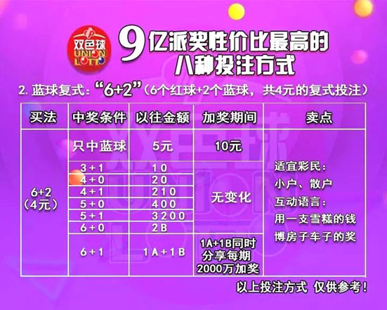 本次派奖仅对双色球游戏规则第九条规定的复式投注有效,复式投注包含红色球号码复式、蓝球号码复 式和全复式三种。你只需要购买最低金额4元的“6+2”蓝球号码复式票,即可参与双色球9亿元派奖。