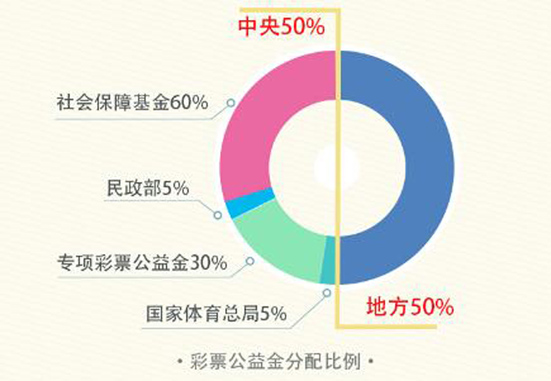 根据2006年财政部发布的《关于调整彩票公益金分配政策的通知》,目前,我国彩票公益金在中央与地方之间,按50:50的比例分配。其中,中央集中的彩票公益金,在社会保障基金、专项公益金、民政部和国家体育总局之间,按60%、30%、5%和5%的比例分配。