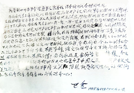 六十年过去了,巴老虽已过世,但是巴老对家乡这支荣军演出队的深情和关爱,早已铭刻在演出队员们的心里,铭刻在历史的长卷之中。(郑克元)