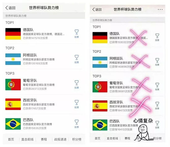 而1/8决赛结束后,某博发起的“世界杯球队势力榜”投票一度成为“东方毒奶”,成功预告了四大强国的相继离开……