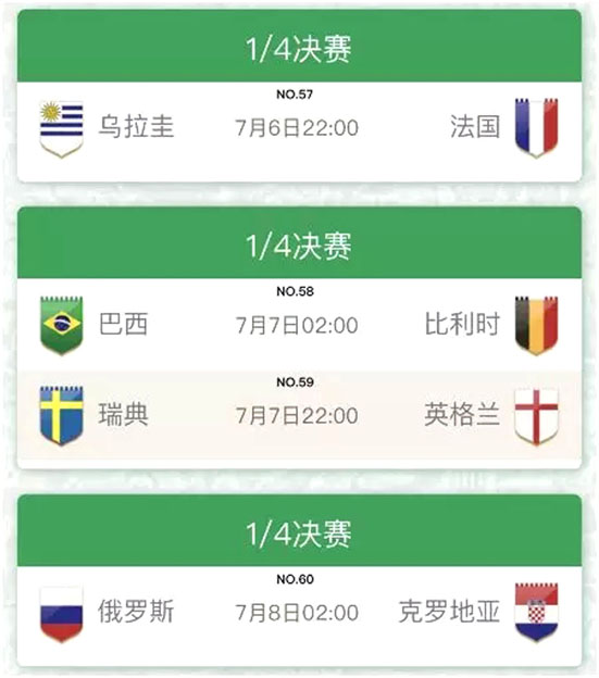 高卢雄鸡法国对阵乌拉圭;桑巴军团巴西迎战比利时;东道主俄罗斯对决克罗地亚;三狮军团英格兰与瑞典展开另一场欧洲内战。哪些球队最终晋级4强,快来竞猜看看吧。