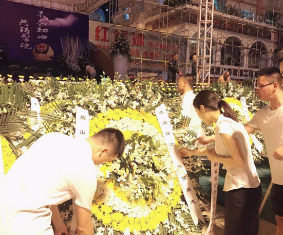 8月9日上午9时,眉山市殡仪馆派出的现场布置和礼仪指导小组首先到达英雄遗体告别仪式布置现场。现场,从一名正在现场布置鲜花的工作人员处了解到,他们自己带来了黄色菊花,为了达到最完美的效果,准备通宵工作,把这些鲜花悉数造型铺在两位英雄的灵柩台四周,希望以他们的绵薄之力,来表达对英雄的无限哀悼,更希望能够减轻英雄家属无比悲痛的心情。