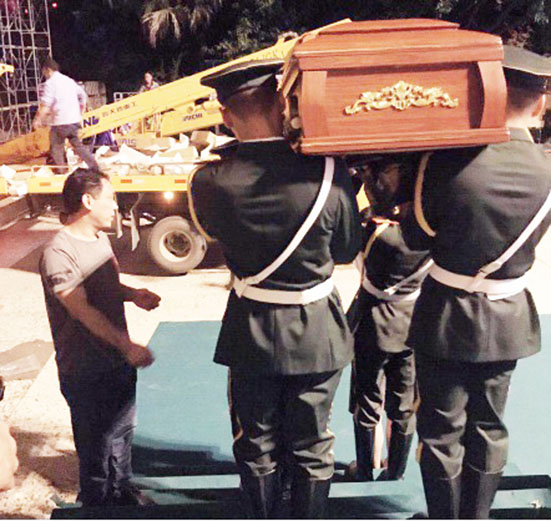 由于承担“起灵”任务的武警从未抬过灵柩,演练时,眉山市殡仪馆的礼仪队长何祥德现场指导,从手势、脚步,到每个步骤都亲身示范了多次。为了帮助武警找准抬灵柩的力度,殡仪服务员殷志超提出,由自己躺进灵柩里进行演练,直至每个细节都无可挑剔。