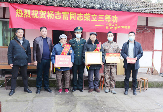 “这是我们村的骄傲,我要和功臣之家合张影”。近日,在一片欢庆的锣鼓声中,中国人民解放军某部、巴中市平昌县退役军人事务局、县人武部、白衣镇人民政府组成的“送喜小分队”,为现役军人杨志富家属送去“三等功”“四有”优秀士兵喜报及党和政府对他们的关怀时,周围邻居听说杨志富在部队荣立“三等功”荣誉后,纷纷前来道贺。