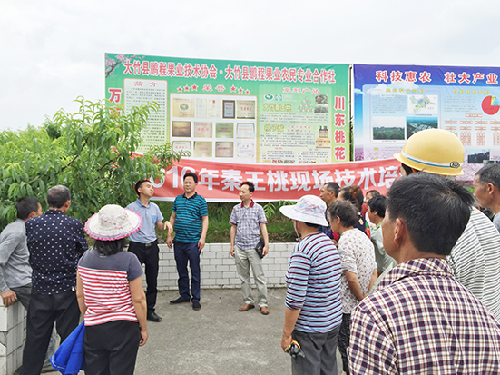 依托新品种建好桃基地。朱鹏程带领合作社与四川省农科院携手合作共同研发培育秦王桃2号、秦王桃3号优良品种,并成功申报“国家地理标志保护产品”。按照“合作社+村级组织+农户”的运行模式,与庙坝、欧家等9个乡镇,包括寨峰、长乐等30个村9238户农户建立合作关系,发展秦王桃12600亩,并带动全县发展3万余亩。