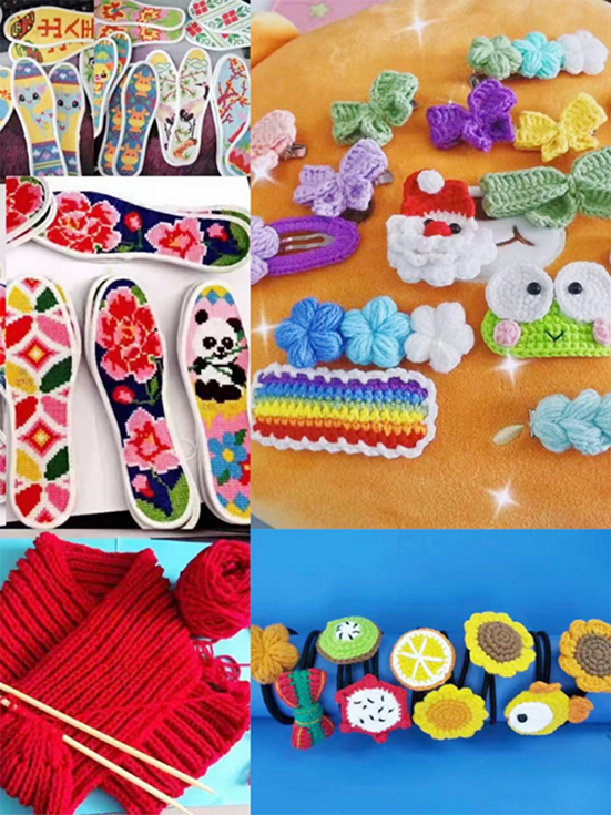 作品说明:本作品为患者手工线上作品,采用胶圈、不同颜色和大小的线、棒针、钩针、鞋垫、胶水制作;作品时间为2022年1月-2月;通过组织患者挑选各自喜欢擅长纺织类手工,选取自己需要的材料,制作出一件温暖的作品,可改善手指抓握功能和肌力,提升患者形象,增强自信,温暖病友,营造和谐友爱氛围。