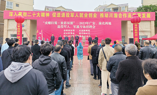 就业渠道不断拓宽。组织退役军人、军属专场招聘活动14场,帮助1500余人成功就业。“戎耀归蜀·放彩双圈”——2023年广安、渝北两地退役军人军属专场招聘会在川渝高竹新区成功举办,得到四川省退役军人事务厅通报表扬。大力促进优秀退役军人到中小学任教,公开选拔、安置7名退役军人成为“兵教师”,涌现出岳池县催龙小学副校长张九洲等一大批先进典型。