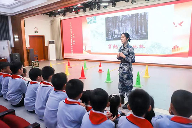 第一次进入课堂,孩子们对“兵教师”黄欣都充满了好奇,纷纷围着她提出各种问题,“老师您是什么兵?”“老师,您会开战斗机吗?”“老师,你跳过伞吗?”“老师,我也想成为空军……”面对孩子们的问题,黄欣开始给孩子们讲解国防知识,为孩子们答疑解惑,并带领孩子们体验军事元素的体育课程,悄然间将爱国主义精神的种子在孩子们心中种下。