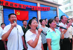 建党90周年之际,内江市东兴区石子镇石子村党支部按照全村2742名村民的意愿,将48名党员和部分有文艺特长的村民组织起来,以合唱、独唱、联唱、歌伴舞等形式,高唱红歌庆祝党的生日,唱响了“共产党好、社会主义好、改革开放好”的主旋律。 (李建明 摄)