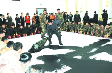 近日,南充市书法家协会会员何文军,在沈阳军区,为部队官兵现场挥毫,在长18米,宽5米的长卷上,写下了“雄风”二字,仅墨水就用了120余斤。其中,18米的卷长寓意“八·一”建军节,5米幅宽代表五星红旗。何先生说:“书写此卷,是为了表达曾是军人的他对部队的敬仰。”(陶启君)