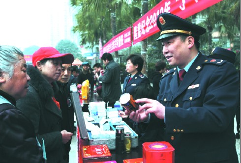 3月15日是国际消费者权益日,内江市东兴区工商、烟草等部门在大千广场设立了消费维权服务点,向消费者传授识假辨假知识,并现场受理消费者申诉、投诉和举报。图为内江市东兴区工商局经检大队副大队长陈雷正在向消费者传授识假辨假知识。(兰自涛 摄)