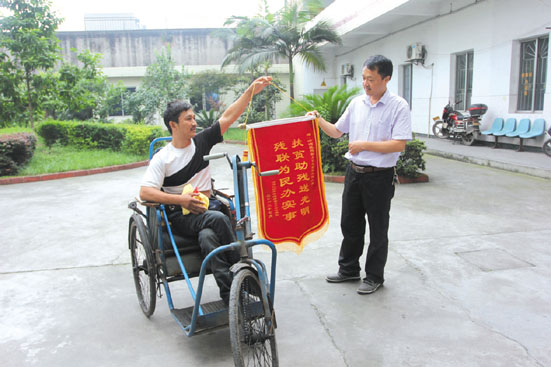 残疾人许逢荣向区残联理事长王钫送锦旗