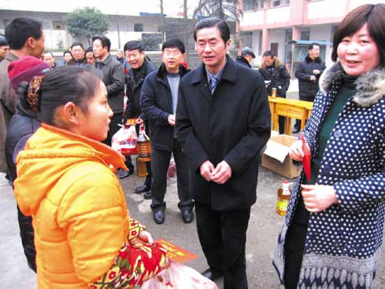夹江县委书记廖克全(右二)、县人大主任蔡建勇(右三)、县委常委、总工会主席石翠莲(右一)等领导,看望慰问残疾人