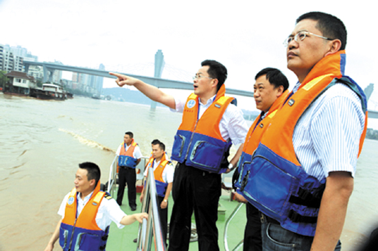 泸州市市委副书记、市长刘强(右三)一行在江中指挥抗灾